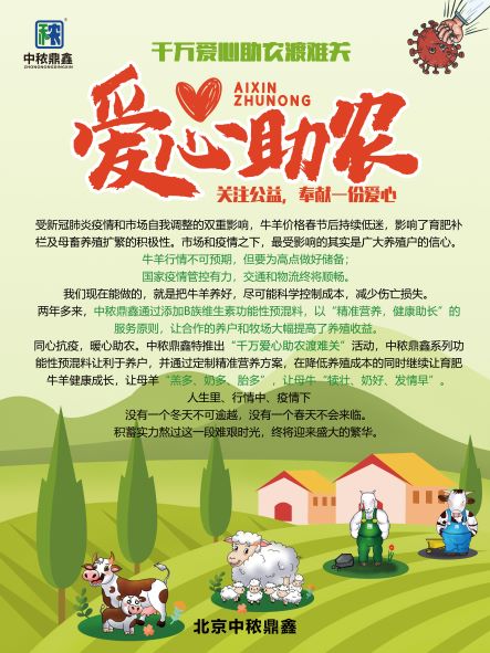 同心抗疫,暖心助農。中秾鼎鑫特推出“千萬愛心助農渡難關”活動,中秾鼎鑫系列功能性預混料讓利于養戶,并通過定制精準營養方案,在降低養殖成本的同時繼續讓育肥牛羊健康成長,讓母羊“羔多、奶多、胎多”,讓母牛“犢壯、奶好、發情早”。